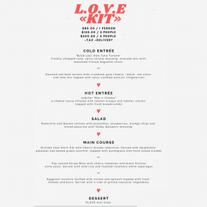 Order one of Traiteur Brera’s Valentine’s Day meal kits (minimal prep time required- we promise!) by February 11th and enjoy dinner with your partner, best friend, or a family member from the comfort of your own home.
