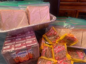 Any and all types of sandwiches are welcome. They ask that each sandwich is individually wrapped in a clear wrapping. You may also give sweets, fruits, snacks, or anything that is individually packed.